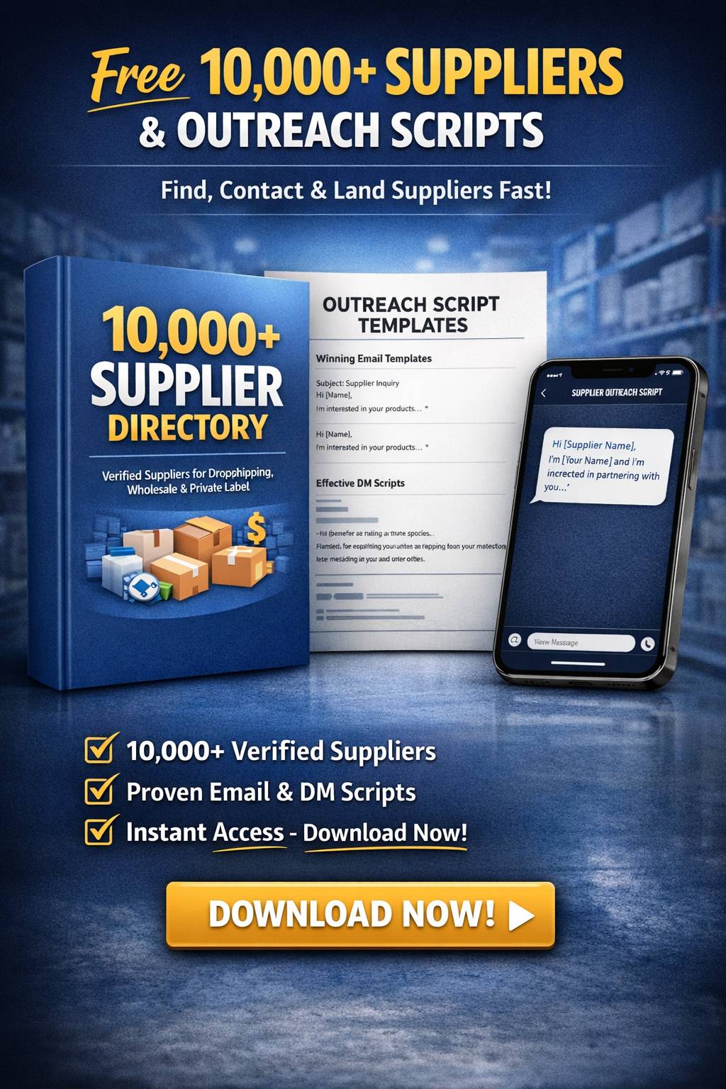 This free resource gives you instant access to 10,000+ suppliers along with proven outreach scripts so you can quickly find, contact, and get approved by suppliers without wasting time or getting ignored — making it easier to start or scale your ecommerce business with a clear, plug-and-play system.